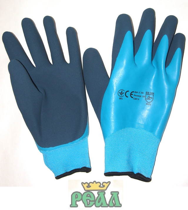 Характеристика: Нейлонові в'язані рукавиці покриті подвійним шаром латексу. Нижній шар гладкий і водовідштовхувальний, другий в області долоні і пальців рифлений для хорошого зчеплення. Також ці рукавиці володіють хорошими бензо-маслостійкими властивостями, а також водонепроникністю.